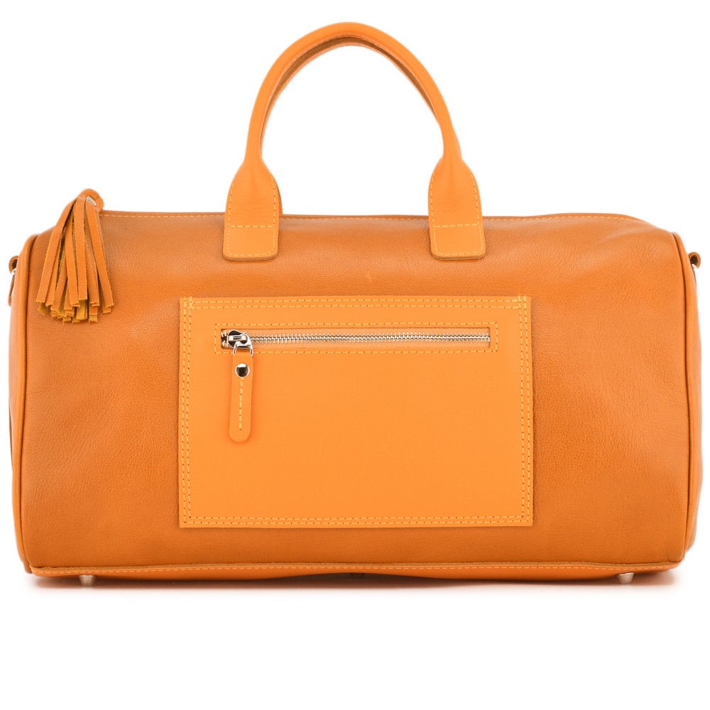 Снаружи, с обеих сторон, расположены карманы на молнии. Один из них прикрыт дополнительно клапаном на кнопках, а молния украшена декоративной кистью из кожи.