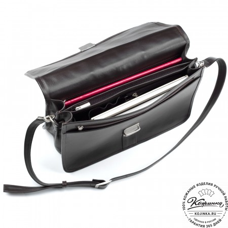 На модели представлен портфель "Версаль" из кожи Антик коричневого цвета.