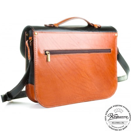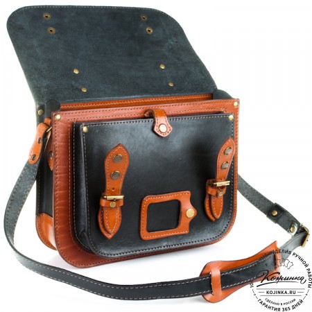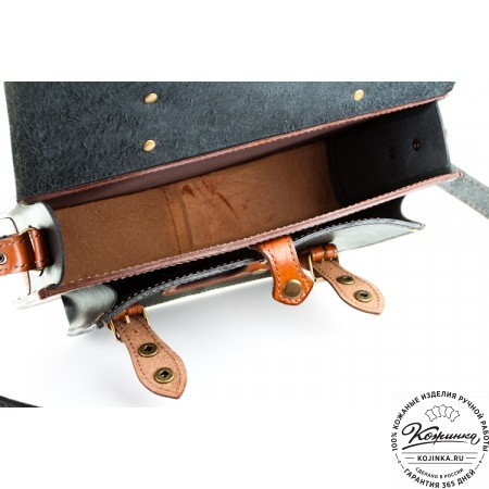 Портфель закрывается клапаном на два портфельных замка, спрятанных под ременными пряжками.