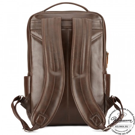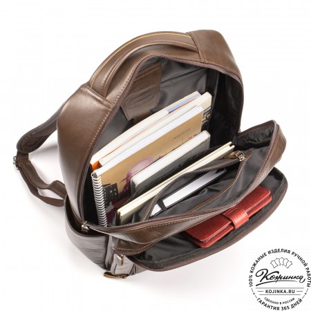 На модели представлен рюкзак "Саше" из кожи коричневого цвета.