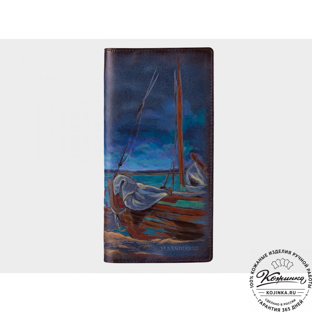 Кожаное портмоне "Лодки на берегу" - вместительное портмоне с ручной росписью по коже. На всю лицевую поверхность портмоне нанесен рисунок - живописный морской пейзаж, такая притягательная картинка из жизни у моря!