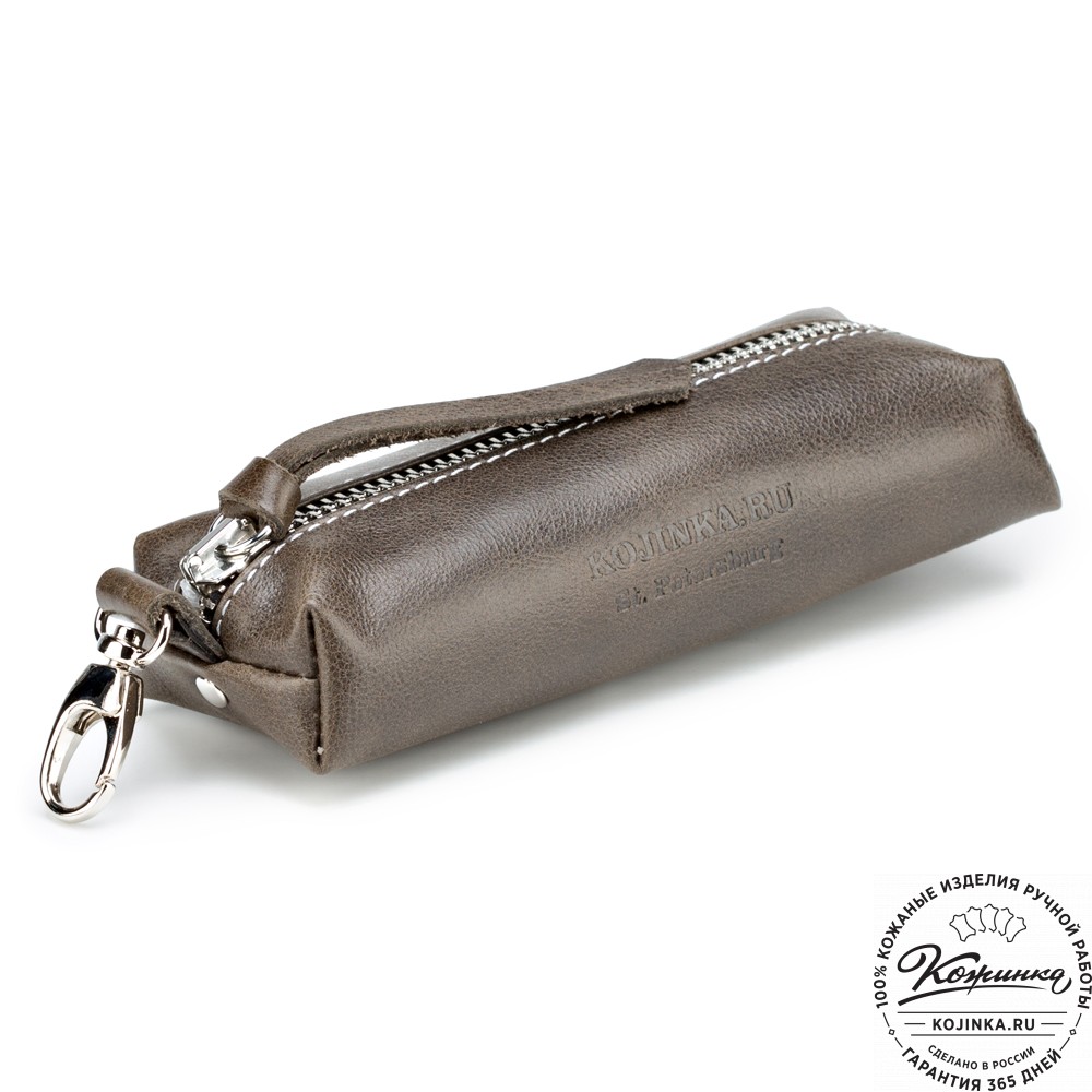 Ключница на молнии, внутри кольцо для ключей, снаружи небольшой карабин. У молнии длинный удобный пуллер из кожи.